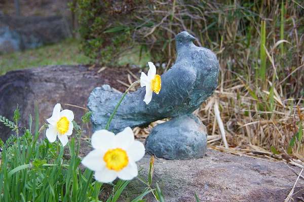 何処からか飛んできて居ついてしまった鳩と、水仙。