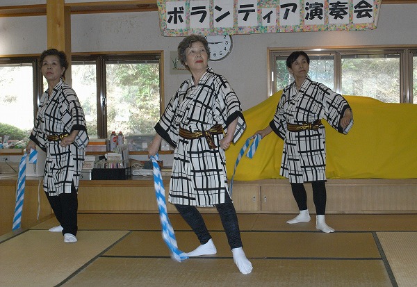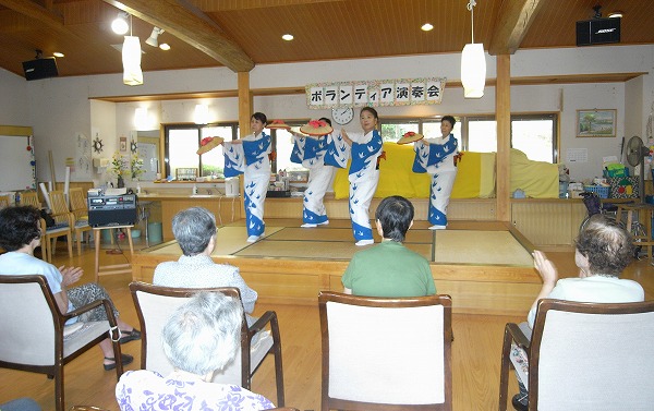 暑い日々が続きますね。そんな中、着物・ハッピを着た宇野婦人会の方々が来所してくれました。団扇や扇子を手に持ちたくさんの演目を披露してくれました。