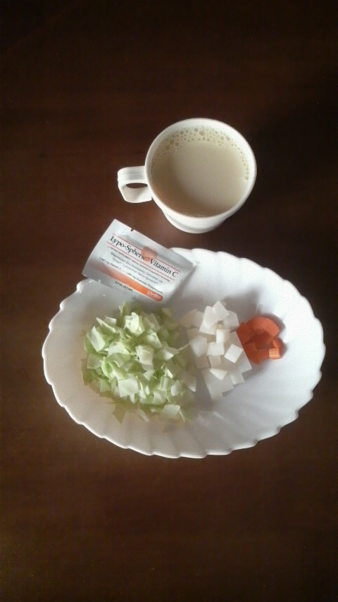 ていた)とビタミンCをミキサーにかけて飲んでいます。丁度カップ2杯位になります。