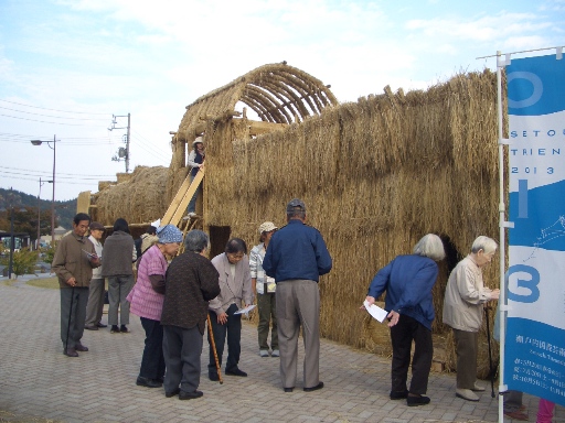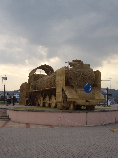 さて今日は先週、芸術祭の為に宇野港前の広場に藁で作った汽車があるので