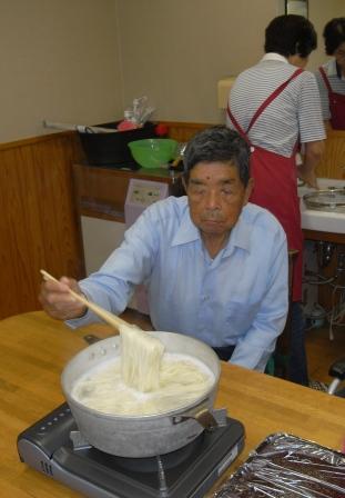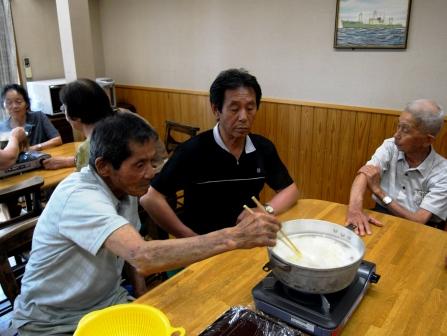 長寿の願いを込めて「素麺」をみなさんで湯がいて食べました☆もちろん「素麺」を湯がくのは、利用者さん!!