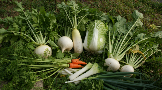 左上から、聖護院大根、大根、白菜、かぶ、ネギ、下仁田ネギ、人参です。