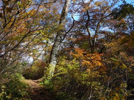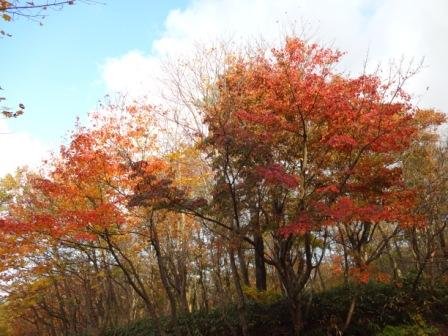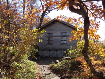 紅葉のなだらかな遊歩道を1時間半ほど歩くと山小屋につきます。