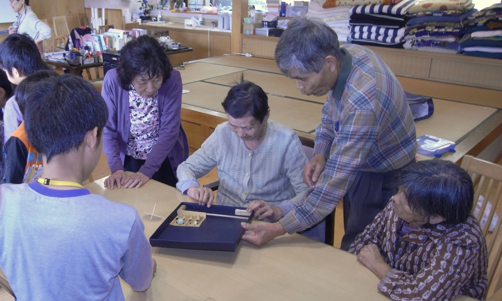 そのコマを一緒に回して遊んだり、ビー玉飛ばしをして子供達と一緒の