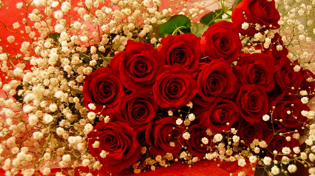 花束の王道、定番中の定番。 深紅の薔薇と純白のカスミ草。