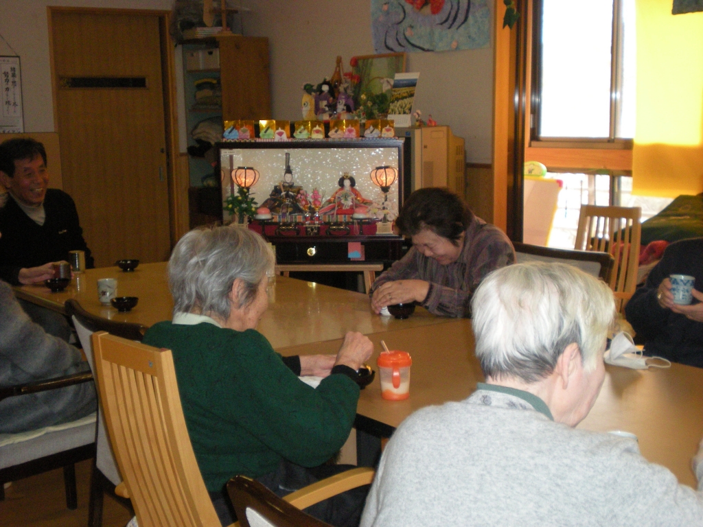 楓 では 雛人形を飾って利用者様と甘酒と雛あられをいただきながら
