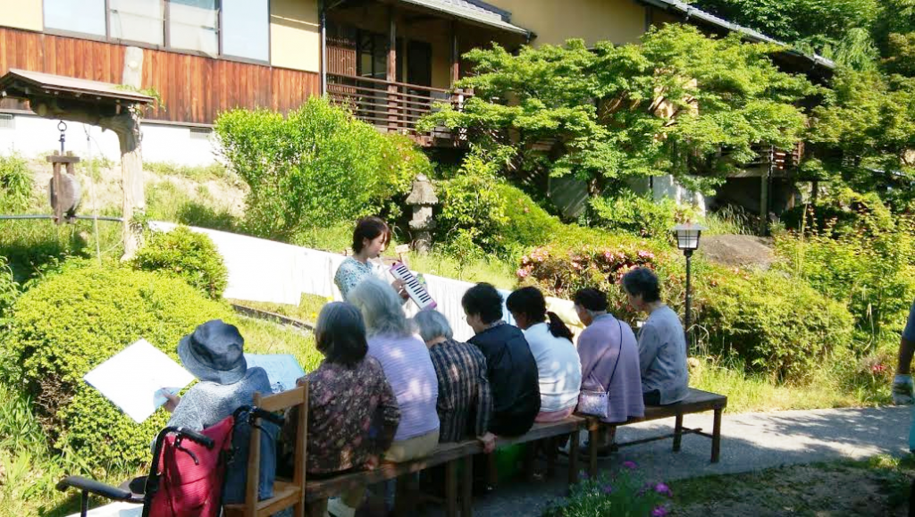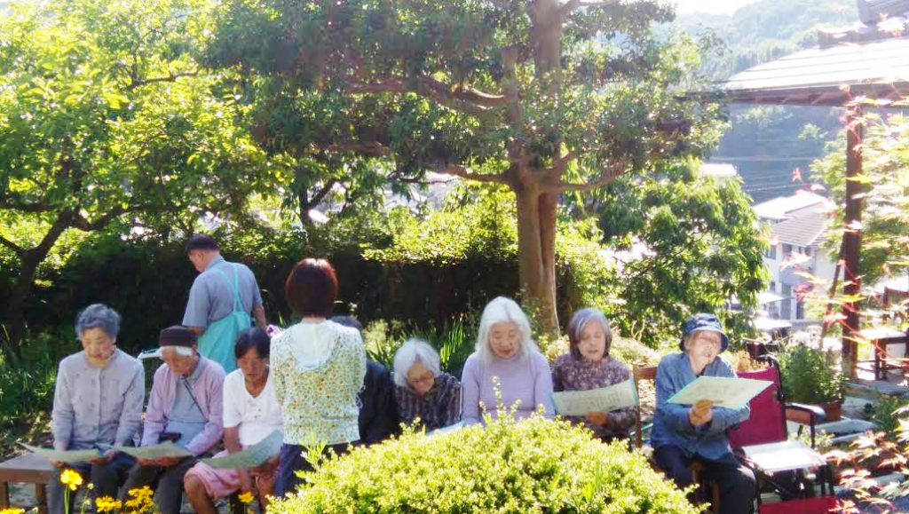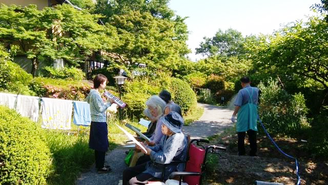 みなさん、熱中症や脱水には気を付けてくださいね。楓では20日土曜の午後から庭の木陰で音楽活動をしました。鳥たちに負けないようにいい声を響かせましたよ。音楽療法士のスタッフの鍵盤ハーモニカの伴奏で楽しい時間を過ごされていました。鍵盤ハーモニカは電源がいらないので何処でも音楽活動ができ便利ですね。