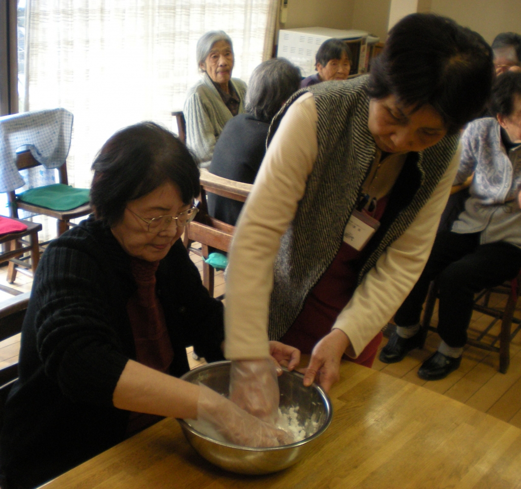 職員と仲良く白玉団子を練っています!!
