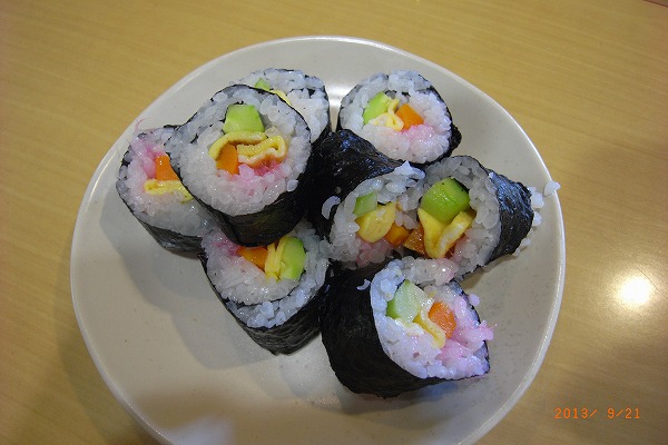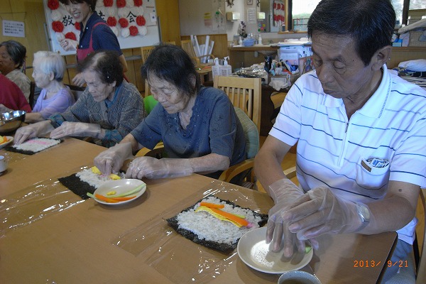 お昼には、利用者さんに巻き寿司をにぎっていってもらいました。普段はされない男性利用者さんも真剣に作っておられました。