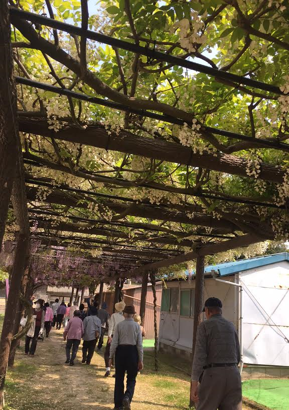 藤棚の下を歩き利用者さんの