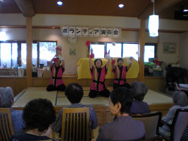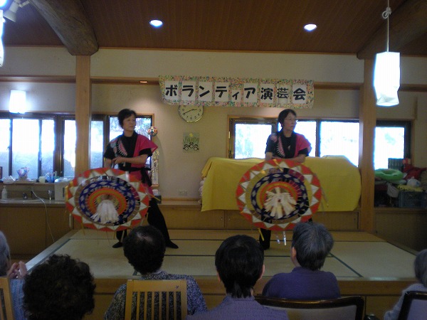 その楽しみの第一弾として、楓に傘踊り・銭太鼓のボランティアさんが来てくださった時の様子をご紹介したいと思います。