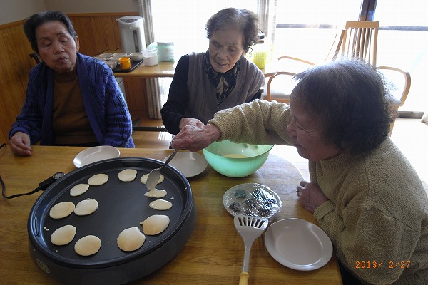 利用者さんがホットプレートで焼いているのは、どら焼きの生地です。